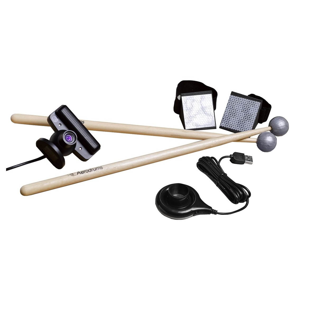 The Aerodrums sticks are fitted with reflective tips and you attached elastic reflectors to your feet. A bright light shines on you whilst a high-speed camera tracks the motion of these markers and determines the triggers.