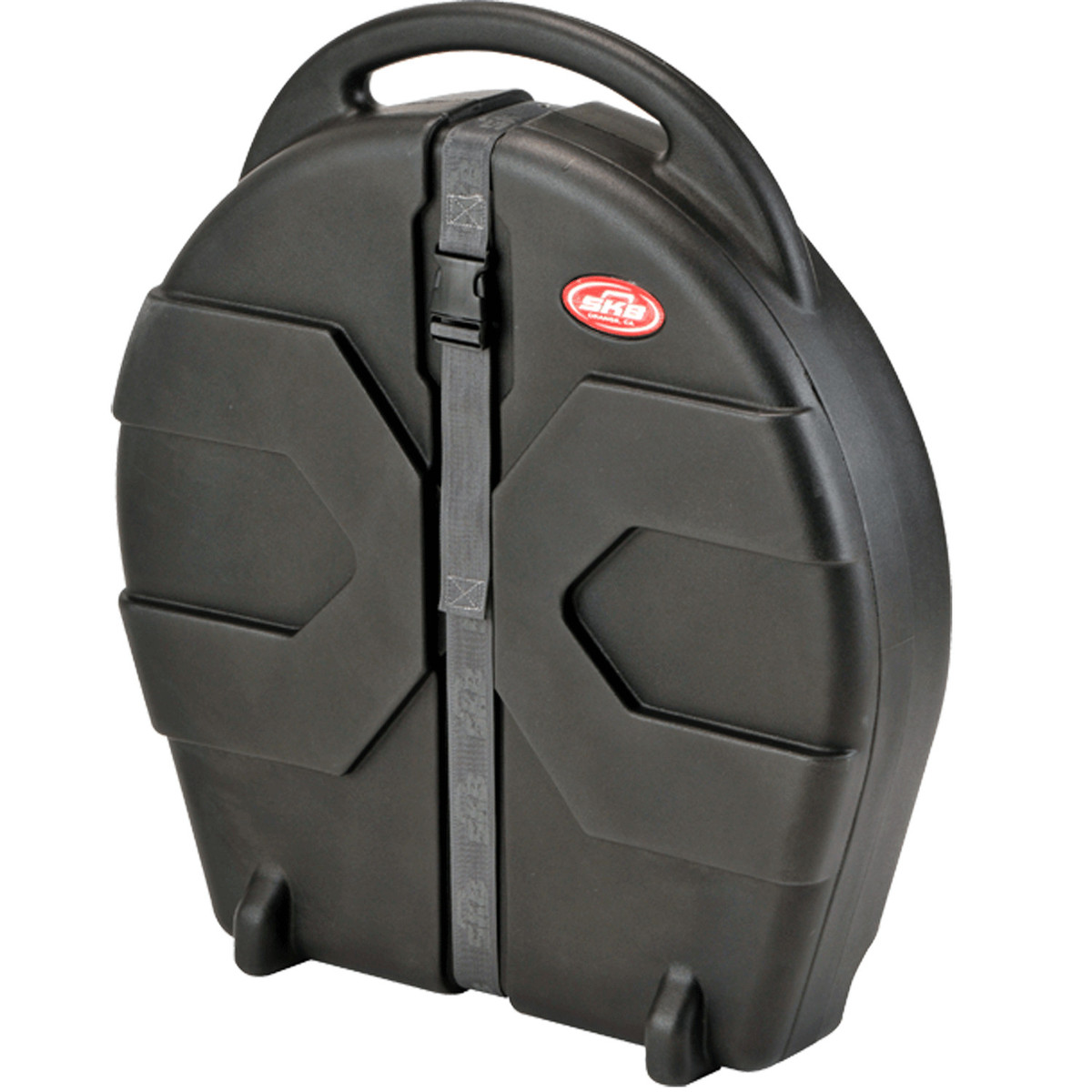 The SKB 22'' Rolling Cymbal Vault is the ideal accessory for any serious drummer. The highly-durable transport case is constructed from heavy-duty LLDP (Linear Low Density Polyethylene) ensuring your Cymbals are safe and secure while transporting them. The welded center post allows you to accommodate up to seven or more cymbals (Fits traditionally shaped cymbals, perfect for any drummer constantly on the move. The Cymbal Vault comes complete with four cymbals pads and a storage pocket for accessories, with the pads ensuring your cymbals are not pressured within the case, protecting the sound edge. The roto-moulded X pattern also means the Cymbal Vault will stack easily with the SKB Roto-X Drum Cases. Additionally the case features a heavy-duty secure strap, built-in wheels and a heavy-duty pull out handle allowing you to easily transport your cymbals.