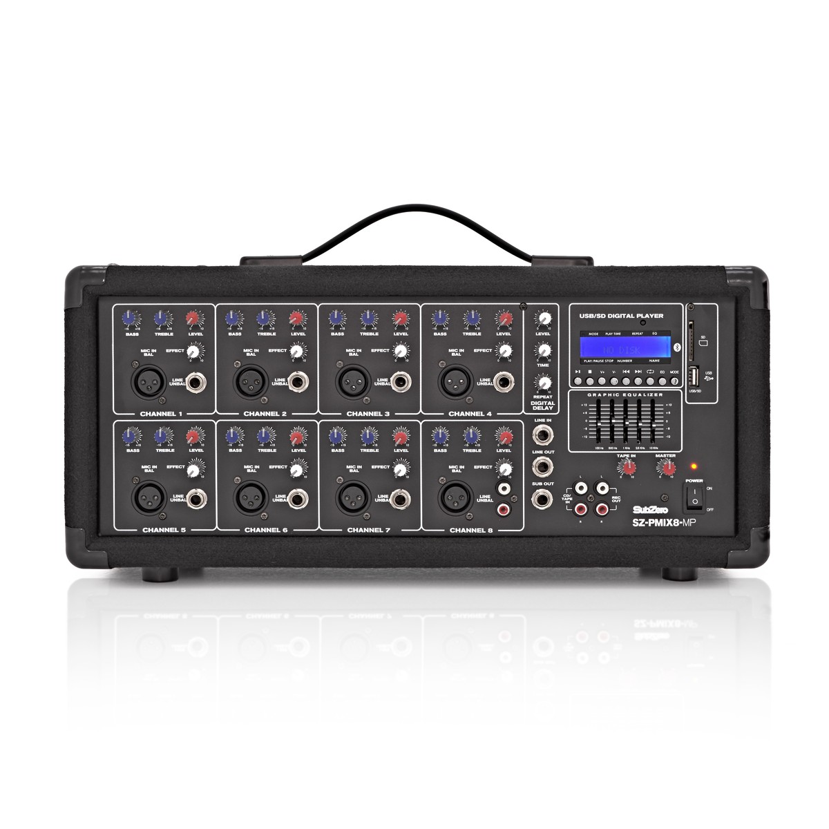 The SubZero SZ-PMIX8-MP3 Powered Mixer features eight channels, each with a balanced XLR input for microphones, and an unbalanced 1/4" Jack line input, making it flexible for both instruments and vocals. Each channel also has a two band EQ and a digital echo effect, allowing for great sound in all kinds of live environments, including spoken word and presentations.