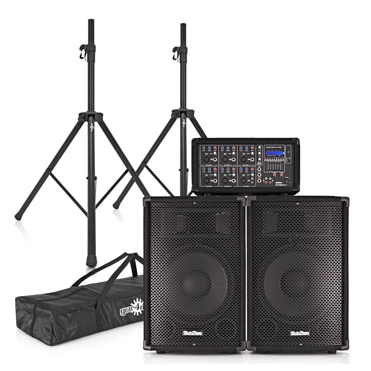 The SubZero SZPA-612 PA system is an all-in-one live sound solution. Connect up to eight microphones or instruments, play MP3s or stream music via Bluetooth. Each speaker includes two drivers – a 12" bass woofer and a high frequency tweeter – for a great bass response which maintains clarity throughout the whole frequency range. This makes the SZPA-612 suitable for any style of music and audio. Housed in carpeted wooden cabinets, this PA system has been built to withstand any inevitable knocks on the road.