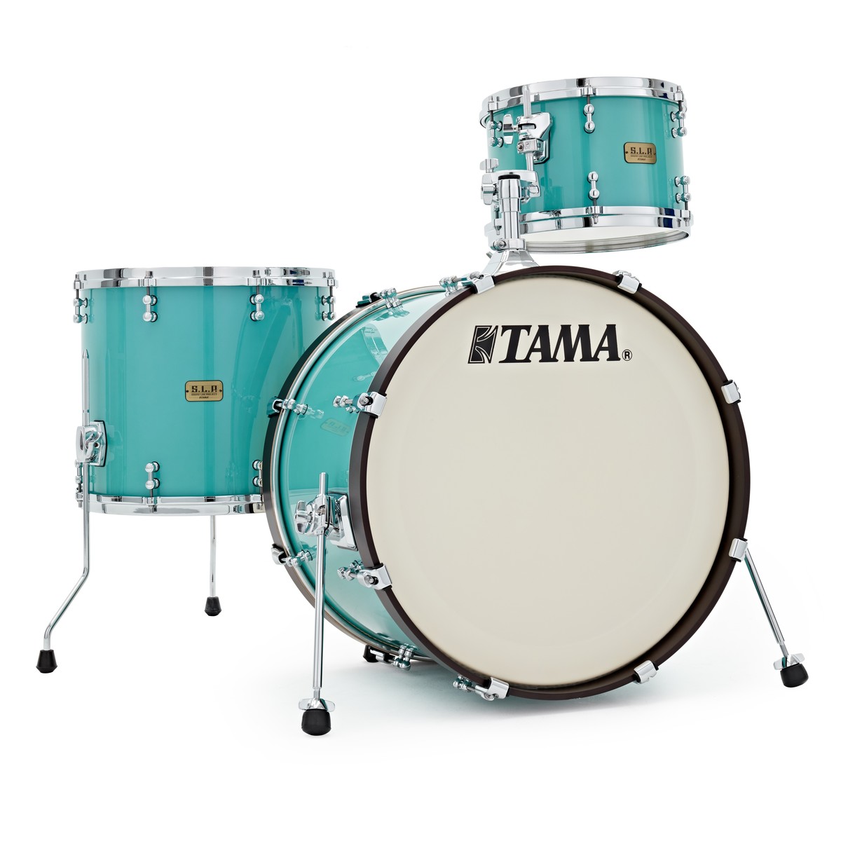 The SLP Fat Spruce Shell Pack features Tama's Direct Flexi-Mount, featuring a two-piece structure that instead of increasing resonance, this system controls the vibration of the shell whilst allowing the shell to resonate more freely than traditional direct-to-shell mounts. The mount is made of a plate that is mounted to the shell and another piece that secures the L-rod of the tom holder/stand. The two sections are connected with a steel shaft, allowing for some horizontal play. This is what controls the vibration of the shell, allowing for increased resonance, projection and tone, as well as providing a smooth decay for a clear sound.